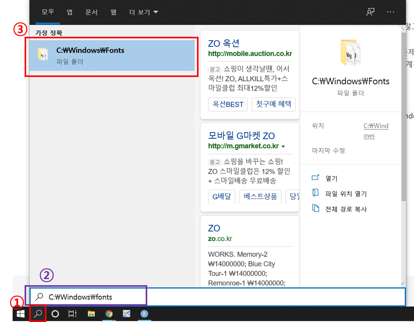 1번 돋보기 버튼을 클릭하시고 2번의 입력칸에 C:\Windows\fonts 을 입력하시고 3번의 폴더를 클릭하시면 됩니다.