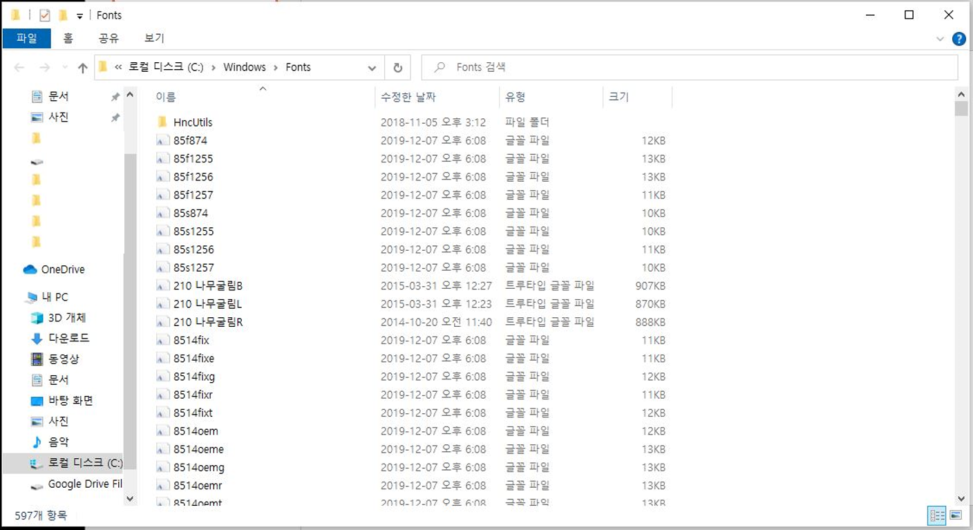 제 폰트들은 전부 C:\Windows\fonts에 저장되어 있습니다.